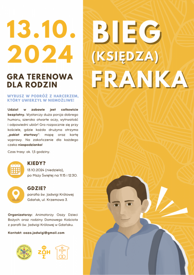Serdecznie zapraszamy wszystkie rodziny do udziału w grze terenowej "Bieg (księdza) Franka"! Gra odbędzie się za tydzień, w niedzielę 13.10.2024, w sąsiedniej parafii św. Jadwigi Królowej, na Orunii Górnej (Gdańsk). Zabawa rozpocznie się po Mszach Świętych o 11:15 i 12:30. Każda drużyna otrzyma mapę oraz zestaw startowy, a po wykonaniu trasy - na wszystkich czeka niespodzianka. Udział w grze jest bezpłatny.